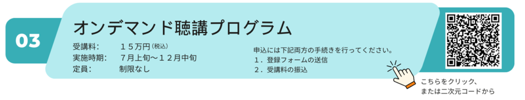 受講希望の方は、プログラム別にご用意しております下記の登録フォームからご登録ください。登録完了メールに記載の振込先情報をご確認いただき、振り込みをお願いいたします。まずは、是非、下記リンク先の登録フォームよりご登録ください。