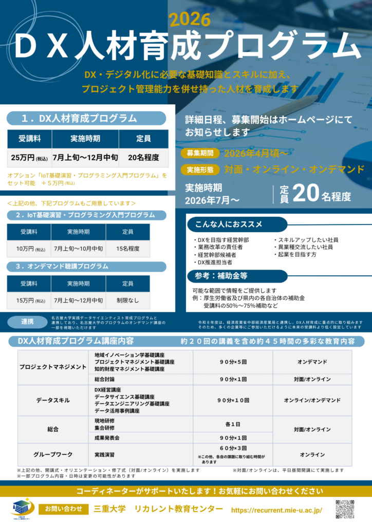 ご要望の多いDX・ICTの分野などについて当センターが用意する「レディーメイド型リカレント教育」として、「DX人材育成プログラム」の令和8年度受講生募集を開始しました。