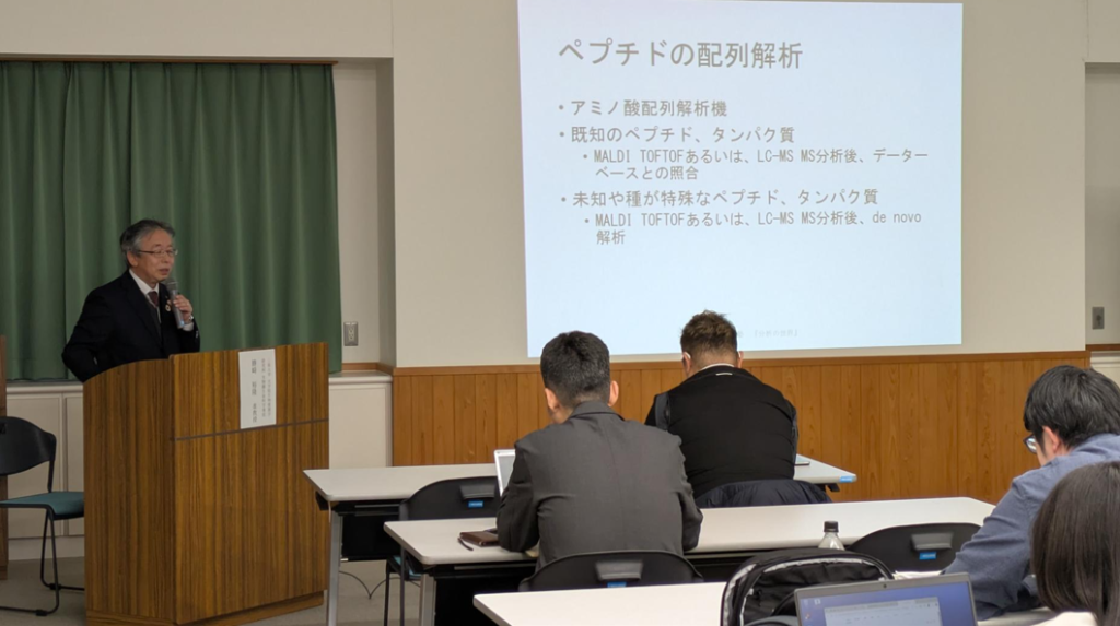 本講義では、それぞれの機器が「何を明らかにできるのか」を中心に、有機化合物の構造決定、タンパク質解析、材料の表面分析や金属分析など、幅広い分析の役割を紹介しました。専門知識がない方でも理解できるよう、物質の“見えない世界”がどのように可視化されていくのかを実例を交えて解説を行いました。